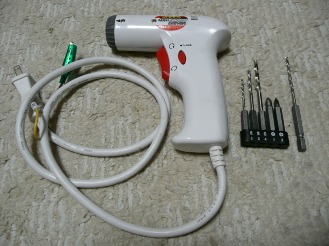 付属で,左から2,3,4ミリのドリルと1,2番のプラスドライバーが付いてきますが,本体のほうがあまり速くなく,付属のドリルは使わないほうが良いかも.一応使えるが時間と労力をかなり使う.